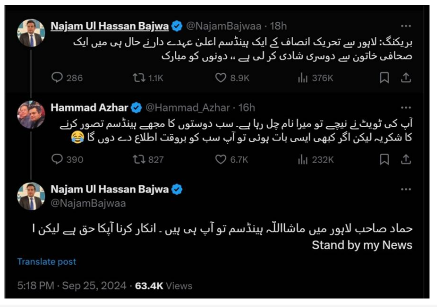 نجم الحسن باجوہ نے سابقہ ٹویٹر اور موجودہ ایکس پر پیغام جاری کرتے ہوئے دعوی کیا کہ لاہور سے تحریک انصاف کے ایک ہینڈسم اعلی عہدے دار نےحال ہی میں ایک صحافی خاتون سے دوسری شادی کرلی ہے