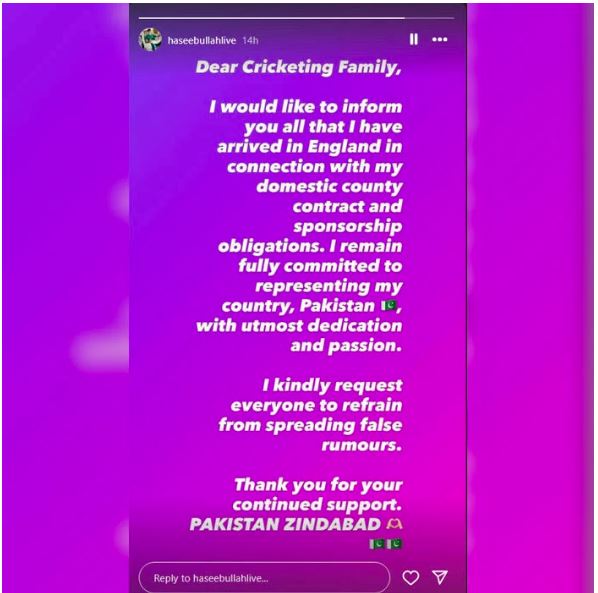 22 سالہ کھلاڑی کا کہنا ہے کہ مستقبل قریب میں بین الاقوامی سطح پر قومی ٹیم کی نمائندگی کرنے کا ارادہ رکھتا ہوں۔انہوں نے انسٹااسٹوری میں لکھا کہ میں آپ سب کو بتانا چاہتا ہوں کہ میں اپنے ڈومیسٹک کانٹی کنٹریکٹ اور اسپانسرشپ کی ذمہ داریوں کے سلسلے میں انگلینڈ آیا ہوں۔انہوں نے واضح کرتے ہوئے لکھا کہ میں صرف کانٹی کرکٹ کھیلنے کے لیے انگلینڈ میں موجود ہوں اور میرا قومی ٹیم تبدیل کرنے کا کوئی ارادہ نہیں ہے۔انہوں نے مزید لکھا کہ میں پوری لگن اور جذبے کے ساتھ اپنے ملک پاکستان کی نمائندگی کرنے کے لیے پرعزم ہوں اور اپنی تمام تر توانائیاں اس مقصد کے لیے وقف رکھوں گا۔