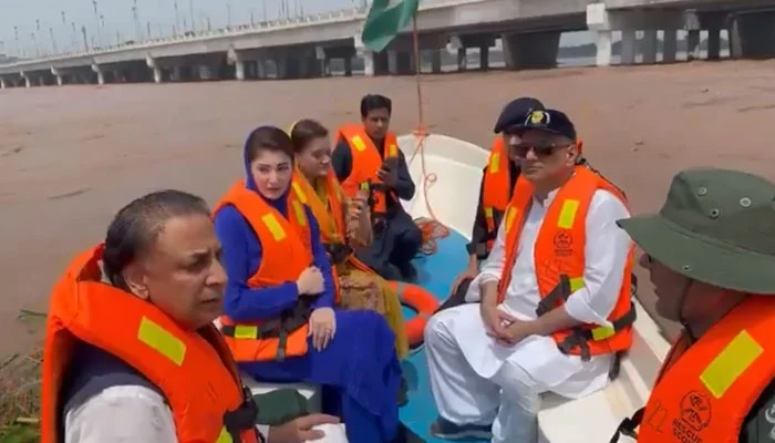 وزیراعلیٰ پنجاب مریم نواز نے کشتی میں سوار ہو کر دریائے راوی میں شاہدرہ کے مقام پر سیلابی صورتحال کا جائزہ لیا۔