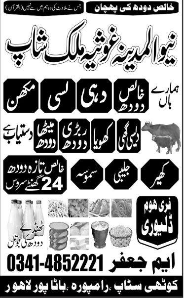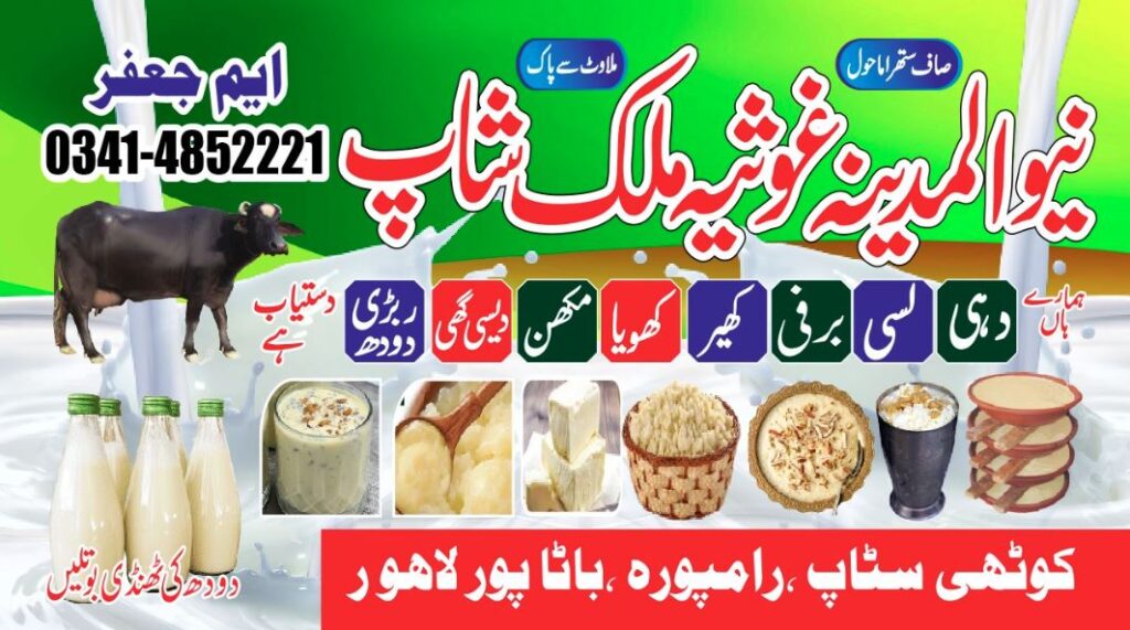 نیو المدینہ غوثیہ ملک شاپ، خالص دودھ ، دیسی گھی اور مکھن کا واحد مرکز