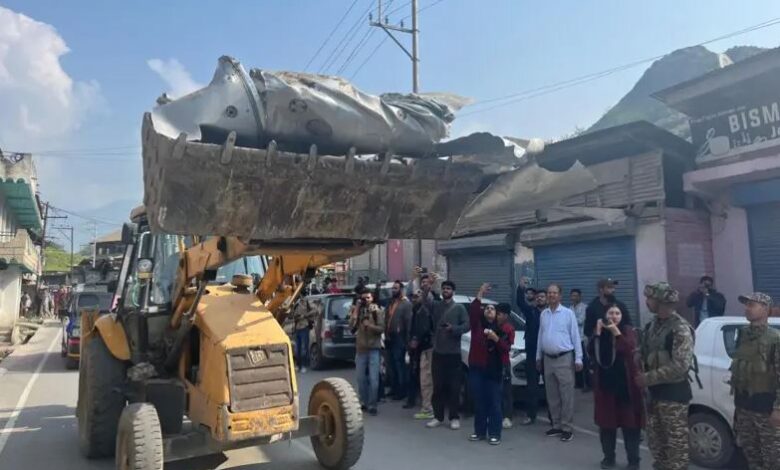 انڈیا کے زیرِ انتظام کشمیر کے علاقے پلوامہ کے قصبے پام پور میں گرنے والے ایک طیارے کے ملبے کو بلڈوزر کی مدد سے منتقل جا رہا ہے