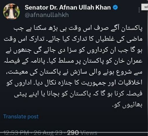 اس معاملہ میں ن لیگی سینیٹر ڈاکٹر افغان اللہ خان کا ایک ٹوئٹ بھی سامنے آیا ہے جس میں انہوں نے کہا ہے کہ پاکستان آگے صرف اسی صورت میں بڑھ سکتا ہے جب ماضی کی غلطیوں کا تدارک کیا جائے انہوں نے ٹوئٹ میں لکھا ہے کہ تدارک اسی صورت میں ہوگا جب ان کرداروں کو سزا دی جائے گی جنہوں نے عمران خان کو پاکستان پر مسلط کیا۔ پانامہ کے فیصلے سے شروع ہونے والی سازش نے پاکستان کی معیشت ، اخلاقیات اور جمہوریت کا جنازہ نکال دیا ، اداروں کو فیصلہ کرنا ہوگا کہ پاکستان کو بچانا ہے یا اپنے پیتی بھائیوں کو؟