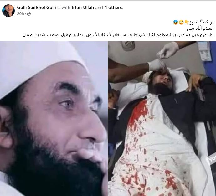 تفصیل کے مطابق فیس بک اور واٹس ایپ کے مختلف گروپوں میں ایک زخمی باریش شخص کی تصویر شیئرکرتے ہوئے دعوی کیا جا رہا تھاکہ اسلام آباد میں مولانا طارق جمیل پر نامعلوم افراد کی طرف سے فائرنگ کی گئی جس کے نتیجے میں مولاناطارق جمیل شدید زخمی ہوگئے۔