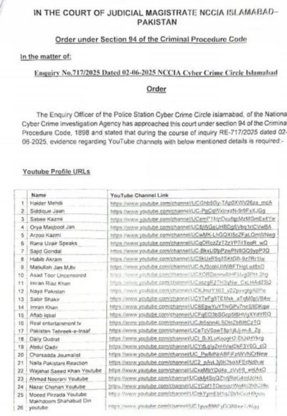 جوڈیشل مجسٹریٹ اسلام آباد عباس شاہ نے یوٹیوب چینلز بلاک کرنے سے متعلق درخواست پر سماعت کے بعد 2 صفحات پر مشتمل حکم نامہ جاری کردیا