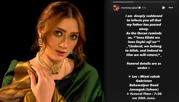 اداکارہ نے اپنی انسٹا اسٹوری میں والد کے انتقال سے متعلق خبر سنائی۔اس کے ساتھ ہی اداکارہ نے نماز جنازہ کی ادائیگی کے حوالے سے بھی مداحوں کو لوکیشن لکھ کر آگاہ کیا۔واضح رہے اداکارہ نے خدا اور محبت 3، عہد وفا، گھاٹا، احسان فراموش جیسے ڈراموں میں اداکاری سے لوگوں کے دل جیتے ہیں۔مومنہ اقبال نے ایک فلم ”دال چاول“ میں بھی کام کیا اور اس فلم میں بھی ان کے معیاری کام کی بدولت ان کو بڑے پردے پر شناخت ملی۔