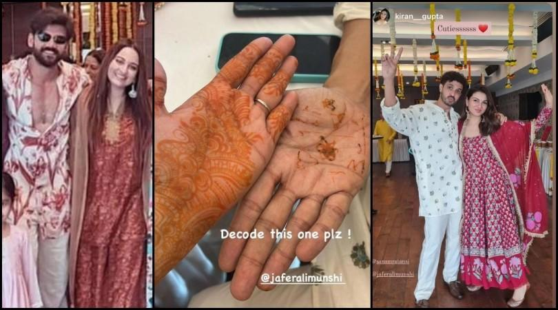 اب سوناکشی اور ظہیر کی مہندی کے فنکشن سے لی گئی پہلی تصویر وائرل ہوگئی ہے۔مگر اس میں بھی سوناکشی کے علاوہ ان کے خاندان کا کوئی فرد دکھائی نہیں دے رہا۔وائرل تصویر جوڑے کے دوست جعفر علی منشی کی جانب سے انسٹاگرام اسٹوری پر شیئر کی گئی جس میں سوناکشی کو براؤن بنارسی اور ظہیر کو وائٹ اور براؤن کنٹراسٹ شرٹ میں دوستوں کے ساتھ پوز دیتے دیکھا جاسکتا ہے۔مہندی کے فنکشن کی مناسبت سے گھر کو گیندے کے پیلے، نارنجی اور سفید پھولوں سے سجا بھی دیکھا جاسکتا ہے۔یاد رہے کہ اس سے قبل بھارتی میڈیا پر بتایا جارہا تھا کہ سوناکشی اور ظہیر اقبال اپنی شادی کو لائم لائٹ سے دور رکھنا چاہتے تھے لیکن اب ان کے دوستوں کی جانب سے ہی شادی کی تصویر شیئر کی جاچکی ہے۔