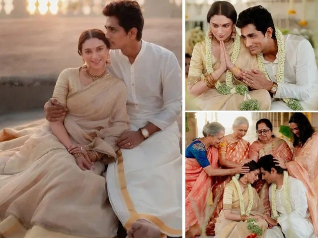 ادیتی را حیدری اور سدھارتھ نے اپنے آفیشل انسٹاگرام ہینڈل پر اپنی شادی کی تصاویر شیئر کرکے مداحوں کو حیران کردیا ہے۔دلکش تصاویر میں دیکھا جاسکتا ہے کہ ادیتی را حیدری نے اپنی شادی کے خاص دن پر ہلکے میک اپ کے ساتھ ہلکے رنگ کی سادی سی ساڑھی زیب تن کی جبکہ سدھارتھ نے ہاف وائٹ رنگ کے لباس کا انتخاب کیا۔سدھارتھ اور ادیتی را حیدری نے اپنی مشترکہ پوسٹ میں ایک دوسرے سے مخاطب ہوتے ہوئے کہا کہ تم میرا سورج، میرا چاند اور میرے تمام ستارے ہو۔