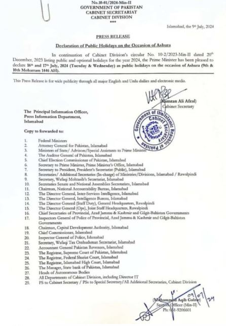 وفاقی حکومت نے محرم الحرام میں یوم عاشورہ 9ویں اور 10ویں محرم الحرام کے موقع پر عام تعطیلات کا اعلان کرتے ہوئے اس کا نوٹیفکیشن بھی جاری کر دیا