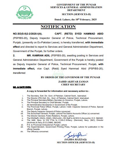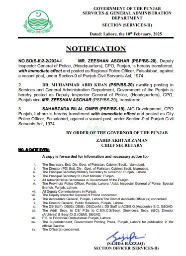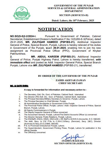 پنجاب بیوروکریسی میں بڑے پیمانے پر تقررو تبادلے کیے گئے،جس میں ڈی آئی جیز اور آئی جیز کے تقررو تبادلے شامل ہیں