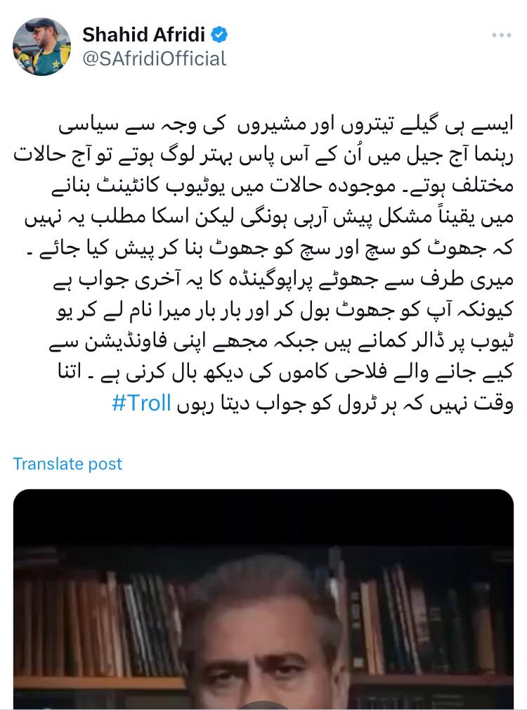 ایکس پوسٹ پر شاہد آفریدی نے عمران ریاض کا یوٹیوب کلپ لف کرتے ہوئے لکھا کہ میری طرف سے جھوٹے پراپیگنڈے کا یہ آخری جواب ہے کیونکہ آپ کو جھوٹ بول کر اور بار بار میرا نام لے کر یو ٹیوب پر ڈالر کمانے ہیں جبکہ مجھے اپنی فاؤنڈیشن سے کیے جانے والے فلاحی کاموں کی دیکھ بھال کرنی ہے۔ اتنا وقت نہیں ہے کہ ہر ٹرول کا جواب دیتا رہوں۔