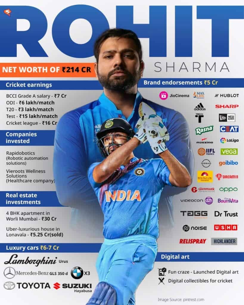 گزشتہ برس بھارتی میڈیا پر شیئر رپورٹ میں بھارت کے اسٹار کرکٹر کی مجموعی دولت 30 ملین امریکی ڈالر یعنی 248 کروڑ بھارتی روپے بتائی گئی تھی تاہم رواں برس جولائی میں سامنے آنے والی بھارتی میڈیا کی رپورٹ میں روہت شرما کی دولت 214کروڑ بھارتی روپے بتائی گئی ہے۔آئیے اب نظر ڈالتے ہیں روہت شرما کی شاندار تنخواہ، مہنگی جائیدادوں اور پرتعیش کاروں کی کلیکشن پر۔