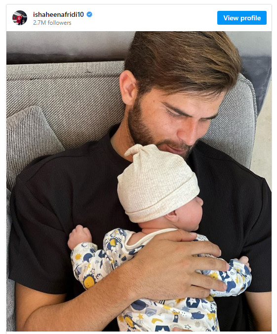 سلیکشن کمیٹی کی جانب سے آرام دیے جانے والے فاسٹ بولرشاہین آفریدی اپنے نومولود بیٹے کے ساتھ وقت گزار رہے ہیں